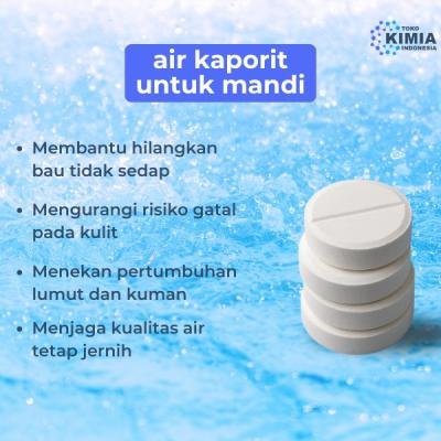 Air kaporit untuk mandi adalah air yang telah diberi tambahan senyawa disinfektan berbasis klorin, seperti kalsium hipoklorit atau trichloroisocyanuric acid (TCCA), dengan tujuan membunuh mikroorganisme dan menjaga kebersihan air. Penggunaan kaporit dalam air mandi umum dilakukan di fasilitas publik seperti kolam renang, pemandian umum, dan bahkan tandon air rumah tangga. Dengan dosis yang tepat, air kaporit aman digunakan dan memberikan manfaat higienis yang signifikan.